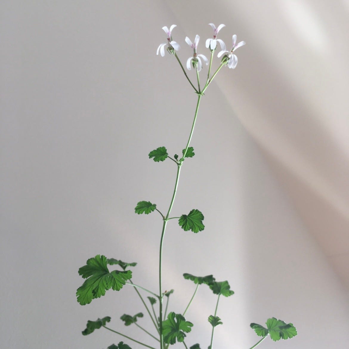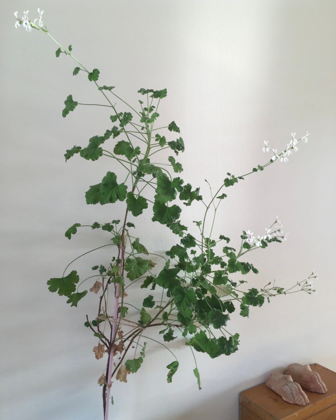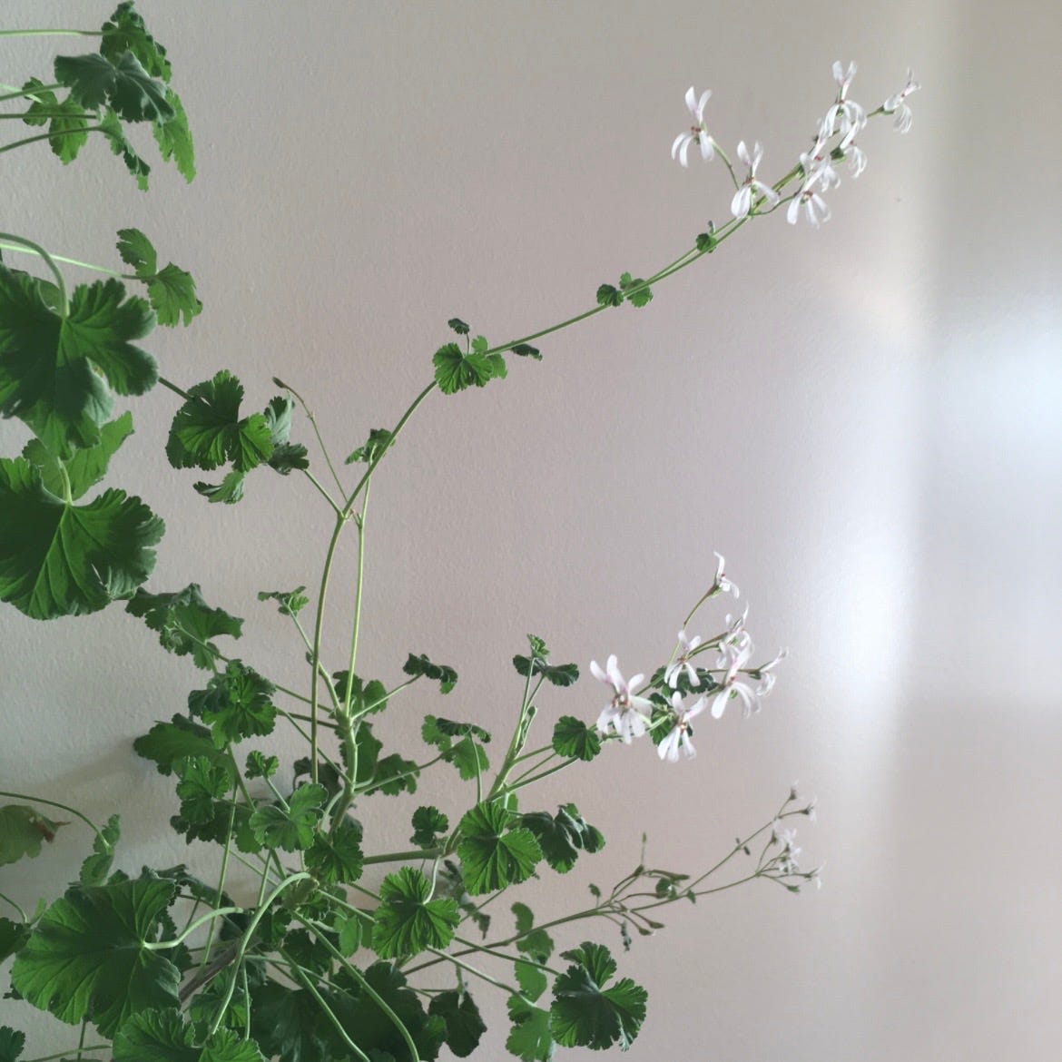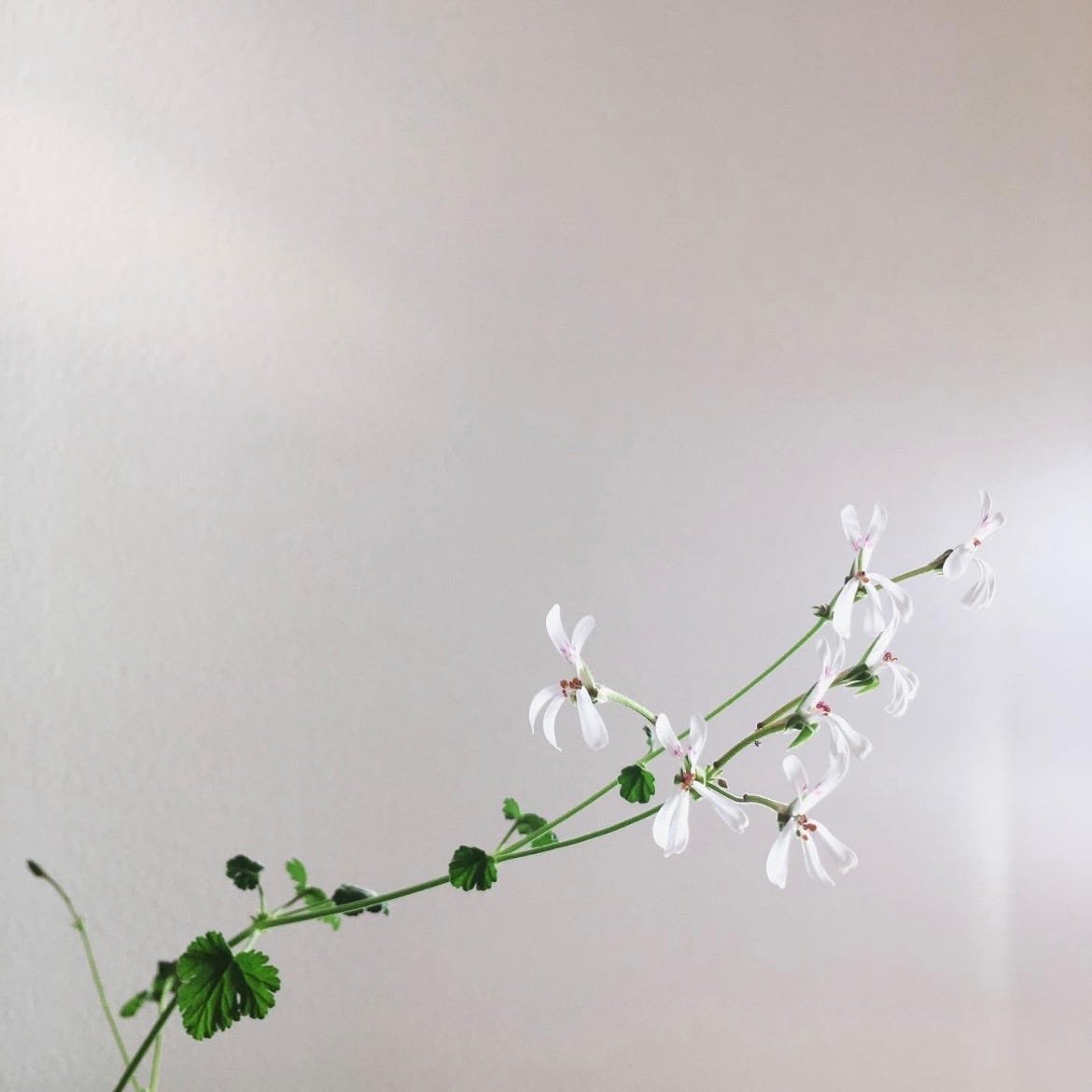 A plant that once grew wild, and still does, in South Africa, then spread across botanical gardens, and at the hands of botanists, grew larger flowers, and developed precious scents. Then became a common hand-me-down, an ordinary houseplant. Red, on the balconies of Teheran, and Istanbul. A tiny white heart in the villages of Ukraine. Pink blossoms waiting on the veranda, here in Sweden. Or, as is the tradition in Swedish cities, pink blossoms in the stairwells of apartment buildings.